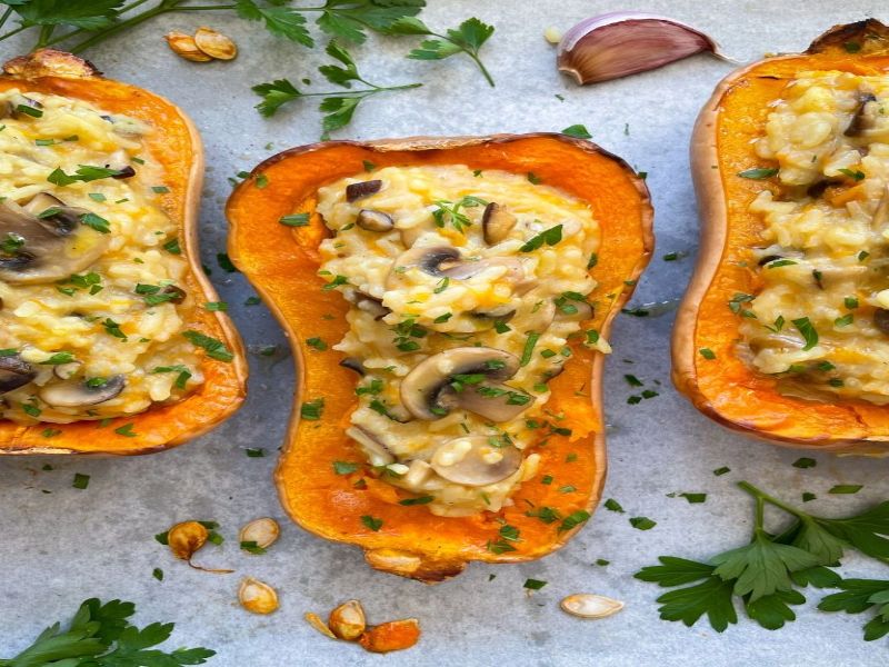 - Rellenamos las calabazas con el risotto, espolvoreamos con perejil fresco y a disfrutar!!