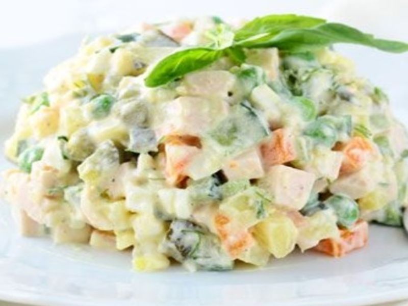 2. Coloca los ingredientes en una ensaladera, añadiendo las arvejas. Añade la mayonesa vegetal y mezcla. Agrega un poco de jugo de limón y más aceite. Condimenta con sal y pimienta, decora con aceitunas .