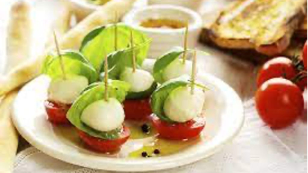 Ingredientes: 2 tomates cherry 4 porciones de queso ricota descremada (1,5 cm x 1, 5 cm) 4 hojas de rúcula aceite de oliva Preparación Cortas